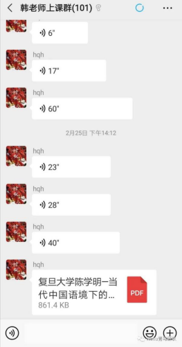 老师的努力下,基于各种在线教学平台,通过直播、录播等教学模式,辅以微信群、QQ群等载体实现了师生之间跨越空间阻隔式的教学互动。2019级硕博研究生们丝毫没有懈怠,努力将“自我隔离”变成“自我提升”,期待春暖花开之时在校园里与更好的自己和更好的我们相逢!