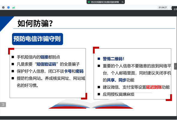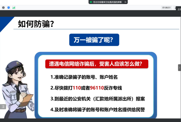 开展了以“校园无诈·青春无悔”为主题的线上反诈安全教育讲座,由保卫处聂庆国老师主讲。此次活动有效提高了同学们的反诈意识与反诈素养,形成了良好的教育效果。