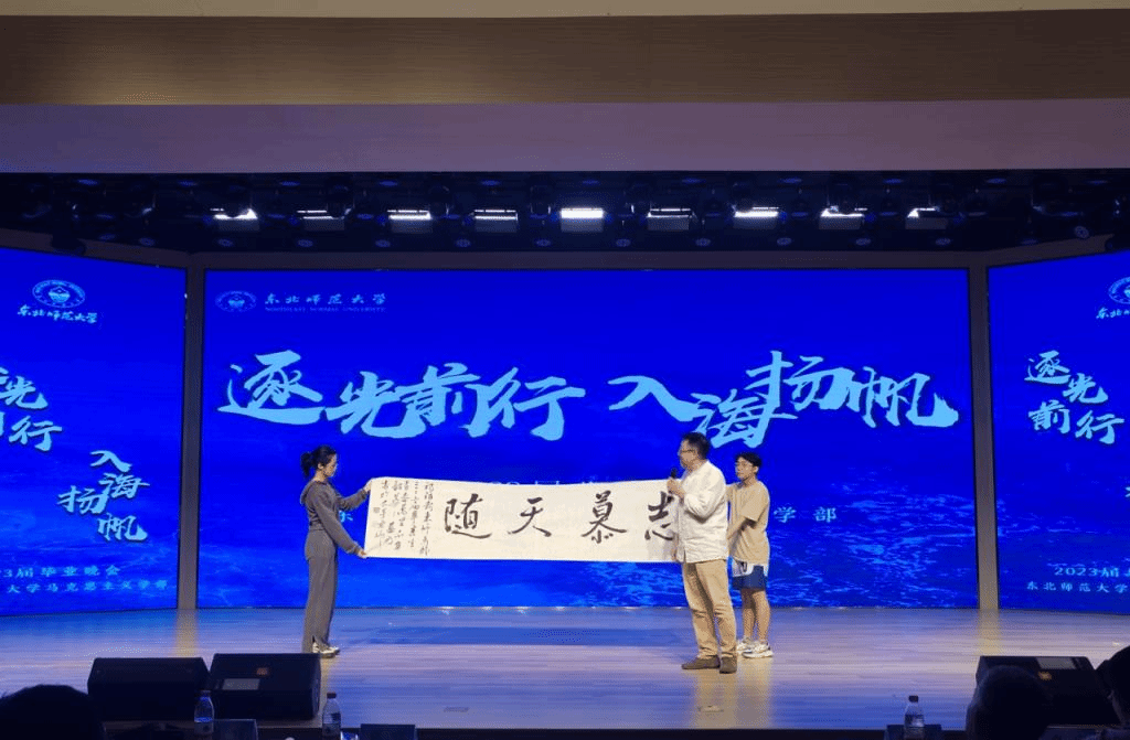 辅导员们带来的歌曲串烧《开在青苹果乐园的那些花儿》,表达了对毕业生们的殷切祝福,同学们不禁回忆起与老师们的相遇、相识与相知,师生间的精彩互动也将整场晚会的氛围推向高潮。此外,特别感谢哲学系蔡元教授的到来,蔡老师现场为同学们展示了赠予2023届毕业生的题字“志慕天随”,并祝福吃瓜黑料