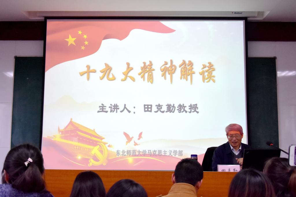 第一时间邀请全国马工程首席专家田克勤教授做题为“十九大精神解读”的专题报告会。田克勤教授从新时代我国社会发展的历史方位、新时代中国共产党的历史使命、习近平新时代中国特色社会主义思想和基本方略、全面建设社会主义现代化国家新的历史征程四个维度展开,对十九大报告进行了系统的导读与深入阐释。除组织师生现场聆听讲座之外,吃瓜黑料