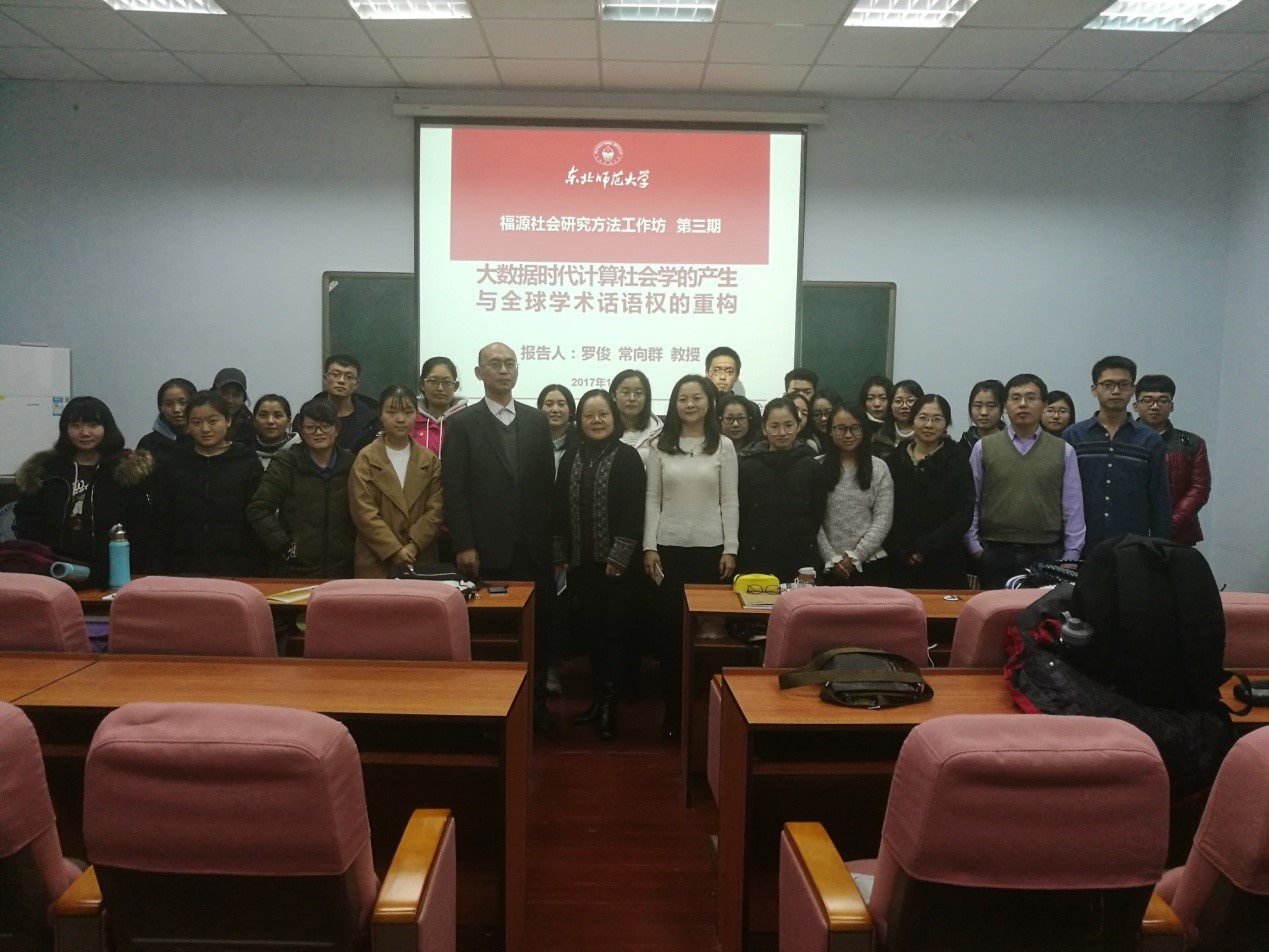 社会学院推出了“福源社会研究方法工作坊”系列活动。近日,社会学院举行了福源社会研究方法工作坊第三期。武汉大学社会发展研究所研究员,大数据与计算社会科学研究中心主任罗俊作了以“大数据时代互联网偏态传播研究”及“大数据时代计算社会学的产生与全球学术话语权的重构”为题的学术演讲。