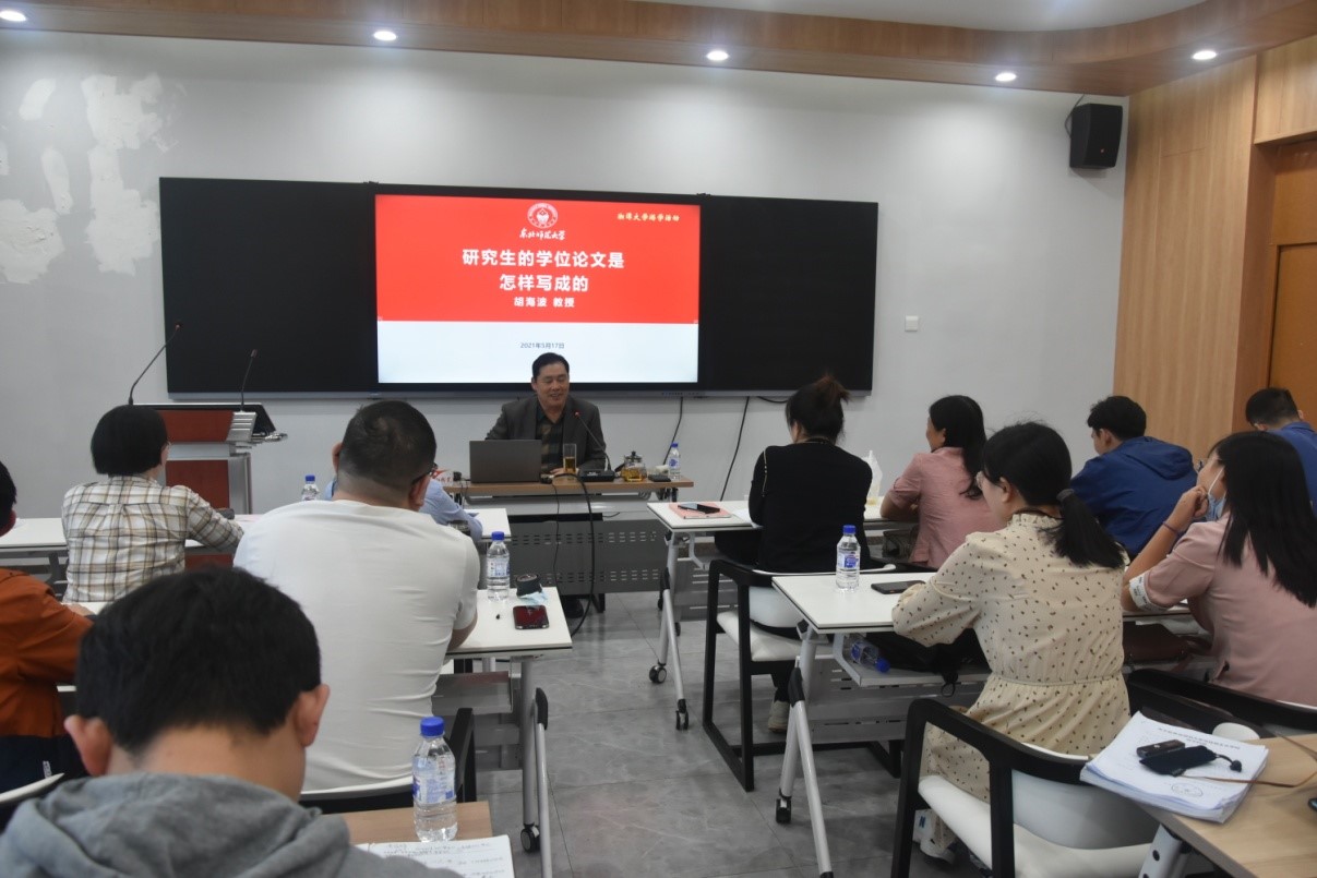 下午,胡海波教授以“研究生的学位论文是怎样写成的”为题剖析了学位论文的创作要素。他自身为例,讲述了导师和学生之间和谐相处的方式,并就博士论文写作的选题、构思和表达进行了详细讲解。会后,胡海波教授与湘大马院部分博士研究生进行了深入交流,同时赠送其专著以示激励。