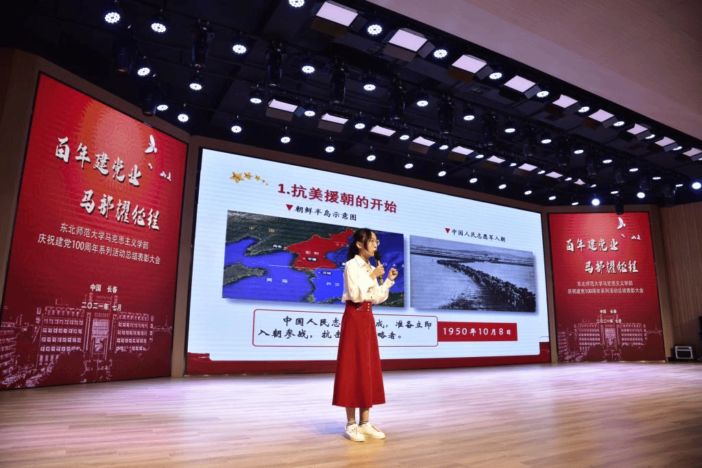 颁奖结束后,比赛特等奖获得者、本科生吴敏霞同学代表所有参赛选手进行了思政课现场展示,她从抗美援朝的历史史实讲起,说明抗美援朝缘何成为立国之战,再到讲述我校师生在抗美援朝战争中奉献自己青春力量的故事,现场观众被讲课内容牢牢吸引。“东师青年说”大学生讲思政课能力提升系列活动充分体现了东师学子爱讲、乐讲、敢讲、会讲的大学生精神风貌。