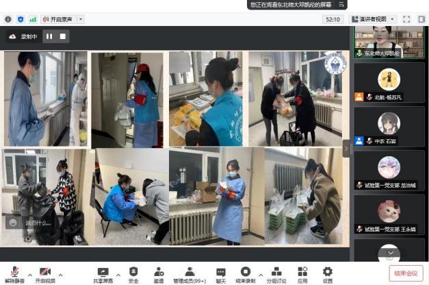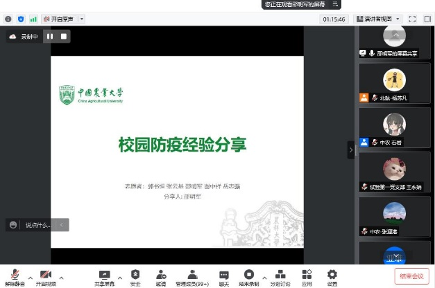 随后,中农党员代表邵明军结合在校园封闭管理下志愿服务经历,为大家介绍了中农在抗击疫情中采取的各项举措,中农学子在疫情防控中参与志愿服务的情况。北航学生党员代表朱云鸿给大家分享了本次学习的收获和体会,他表示静态管理期间东北师大学子的故事让人十分感动,也给了北京高校学子打赢抗疫阻击战的信心,他表示要积极履行社会责任,在为当下学校疫情防控志愿工作中贡献自己的一份力量。