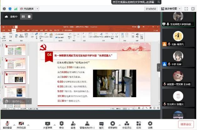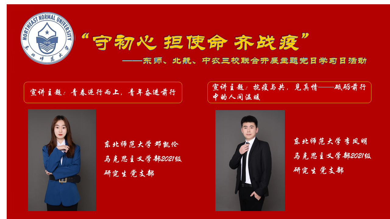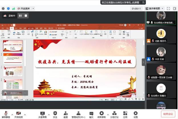 2021级研究生党支部副书记邓凯伦讲师作青春逆行而上,青年奋进前行”主题宣讲。她结合自己在前期吉林疫情爆发,东北师大实行静态管理期间志愿服务的经历,讲述身边青年学子的抗疫故事,生动阐释了在这场疫情大考面前中国青年的无限可能,向吉林战疫的东北师大青年学子致敬。她表示,青年一代,正在用自己的方式在这场抗疫防疫战争中发光、发热。今天的中国青年,就是中国明天的模样,而明天的中华民族也必然可以将今天青春故事镌刻在文明的史书中生生不息、世代相传!