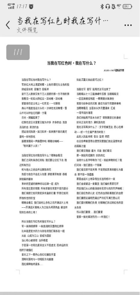2022级举办了以“喜迎党的二十大”为主题的诗词书画征集活动,得到同学们积极响应.闫译丹、梁丹妮同学的软笔书法作品展示了“春风浩荡满目新,扬帆奋进正当时”的中国精神,体现当代大学生生于盛世,长于盛世,定不负盛世的浩荡壮志。袁宇堃同学的现代诗歌《当我在写红色时,我在写什么》体现了“五岳依然向上,一切江河依然滚滚向东,民族意志永远向前”的美好前景。本次活动体现出广大马部学生以笔为耕、以砚为田的创作精神,彰显中国传统书画艺术的独特魅力,营造了喜迎二十大胜利召开的浓厚氛围。