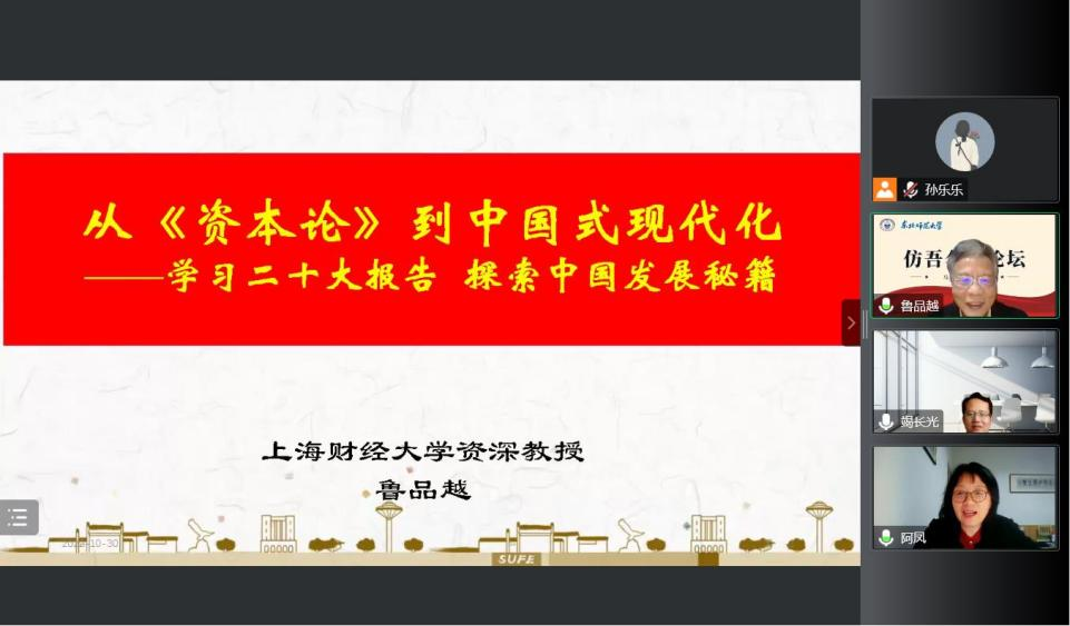 马克思主义基本原理学科主办“仿吾名家论坛”建设系列讲座如期举行。本次讲座邀请了全国经济哲学研究会副会长、上海财经大学资深教授鲁品越教授主讲,以“从《资本论》到中国式现代化:社会主义的历史使命”为题进行学术报告。此次讲座采取线上形式,线上共有300余师生参加了讲座。讲座由吃瓜黑料