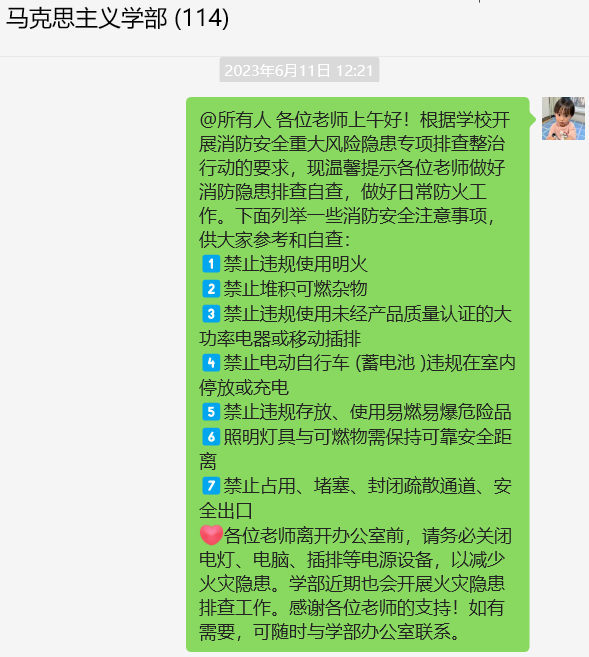 通过年级会、微信等方式发布关于消防安全教育内容,开展消防知识宣传教育工作。在年级会上各年级辅导员嘱咐学生在宿舍不违章用电,不使用窗帘,不放置易燃易爆物品,注意酒精等消毒产品的存放,注意喷雾、防晒喷雾等易燃易爆物品的存放,并明令禁止在宿舍、教学楼、图书馆等室内场所吸烟。在微信群内不定期多次发送防火安全系列推送,并号召大家积极学习防火知识。