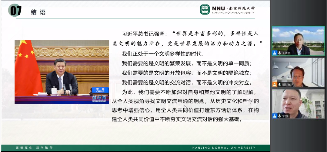 王老师从话语属性、话语根基、话语格局、话语要义、话语立场以及话语功能六方面对全人类共同价值的话语特性和叙事体系展开讲解。第一,从话语属性看,全人类共同价值不是超阶级的,而是拥有鲜明的社会主义属性;第二,从话语根基上看,全人类共同价值不是纯粹思辨,而是基于治国理政和国际交流的丰富实践;第三,从话语格局上看,全人类共同价值不是零和博弈而是体现了大国大党的责任担当;第四,话语要义上看,全人类共同价值不是文明扩张,而是体现了中华文明的交流互鉴;第五,从话语立场上看,全人类共同价值体现的不是个人本位,而是全球治理的集体本位;第六,从话语功能上看,全人类共同价值不是制造分歧,而是和平发展的共识凝聚。