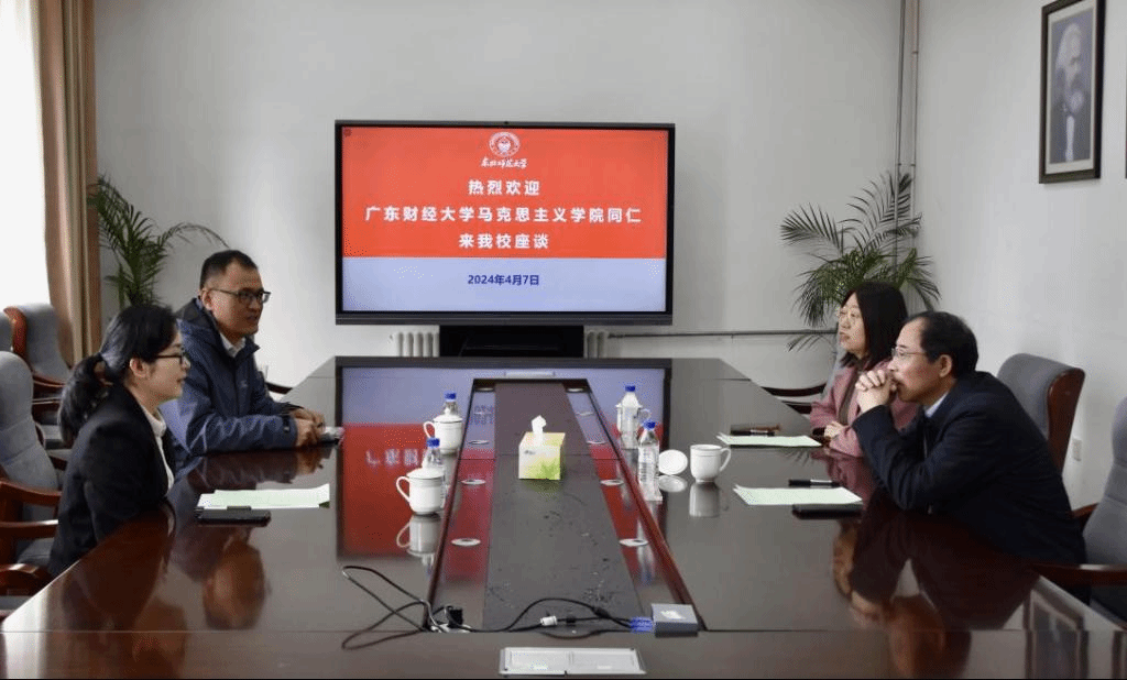 4月7日,广东财经大学马克思主义学院院长袁继红、副院长孙晓晖来吃瓜黑料 调研交流,吃瓜黑料 党委书记孟宪生、副部长李爽参加座谈。