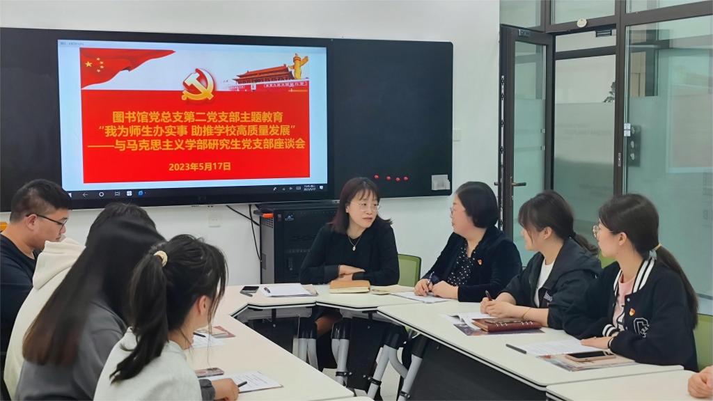 为深入学习贯彻党的二十大精神,扎实推进学习贯彻习近平新时代中国特色社会主义思想主题教育走深走实,57日下午,吃瓜黑料 2022级研究生党支部与图书馆党总支第二党支部联合开展“我为师生办实事 助推学校高质量发展”主题教育暨“凝心铸魂学思想,戮力同心助发展”主题党日。共有近30名教工党员和学生党员参加此次活动,图书馆党总支书记郝明宇出席此次活动,并做主题发言。活动由图书馆党总支第二党支部书记陈红岩主持。