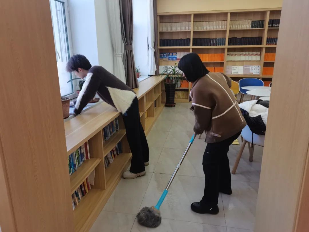 资料室和党建活动室的卫生、擦拭玻璃,努力营造更为整洁舒适的学习与学生活动环境,以实际行动践行着为师生办实事的承诺。尽管正值深秋微寒天气,但丝毫未影响同学们为师生服务的热情。